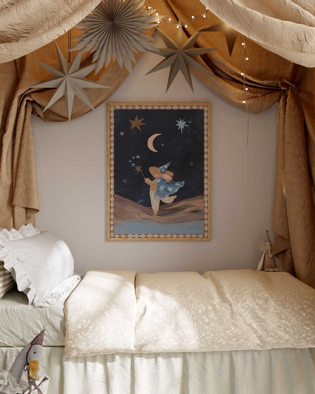 The Wizard Bunny brings a touch of magic to your little one’s room with our brand new art print. Hand-painted in acrylic, this enchanting design features a bunny dressed as a whimsical wizard under a dark night sky.