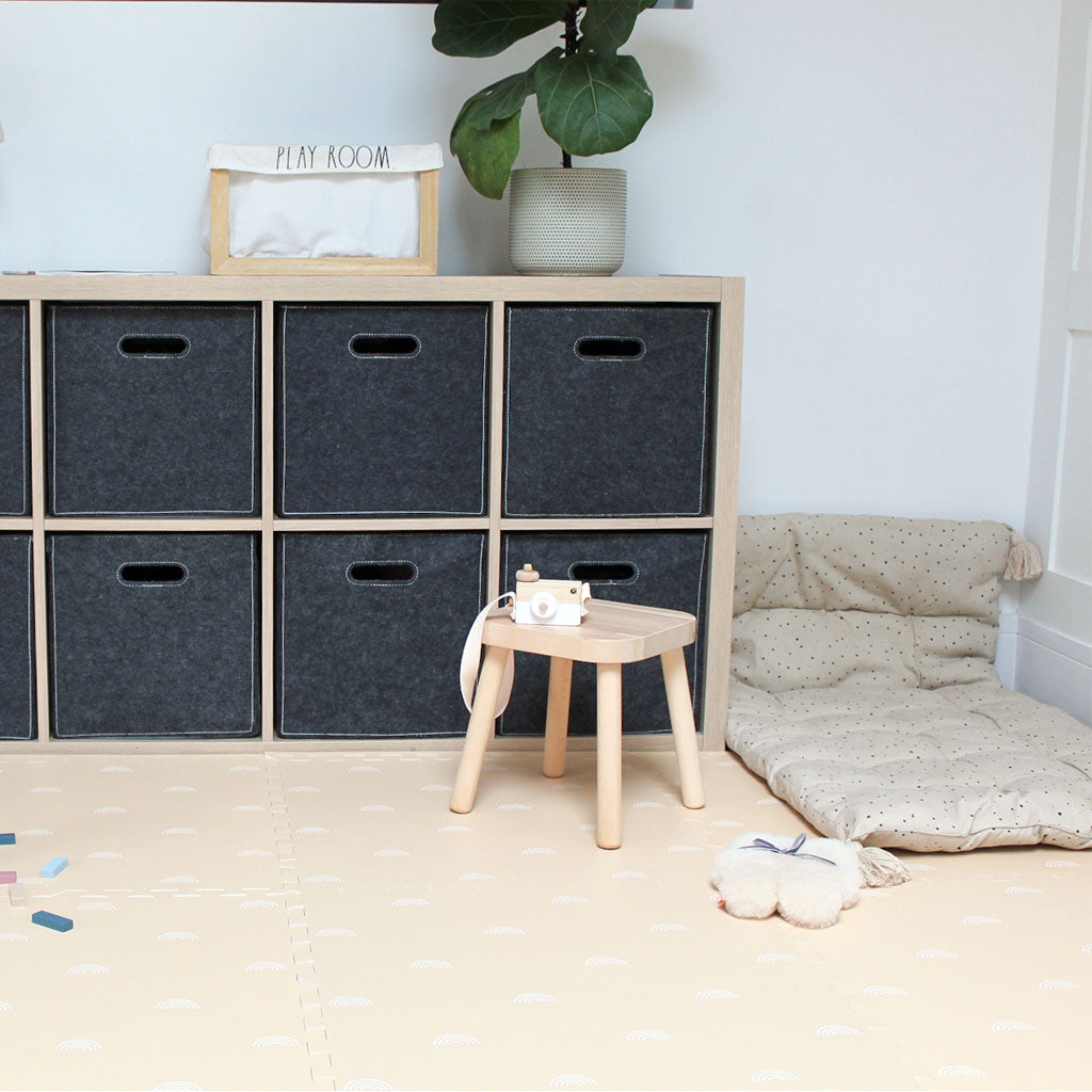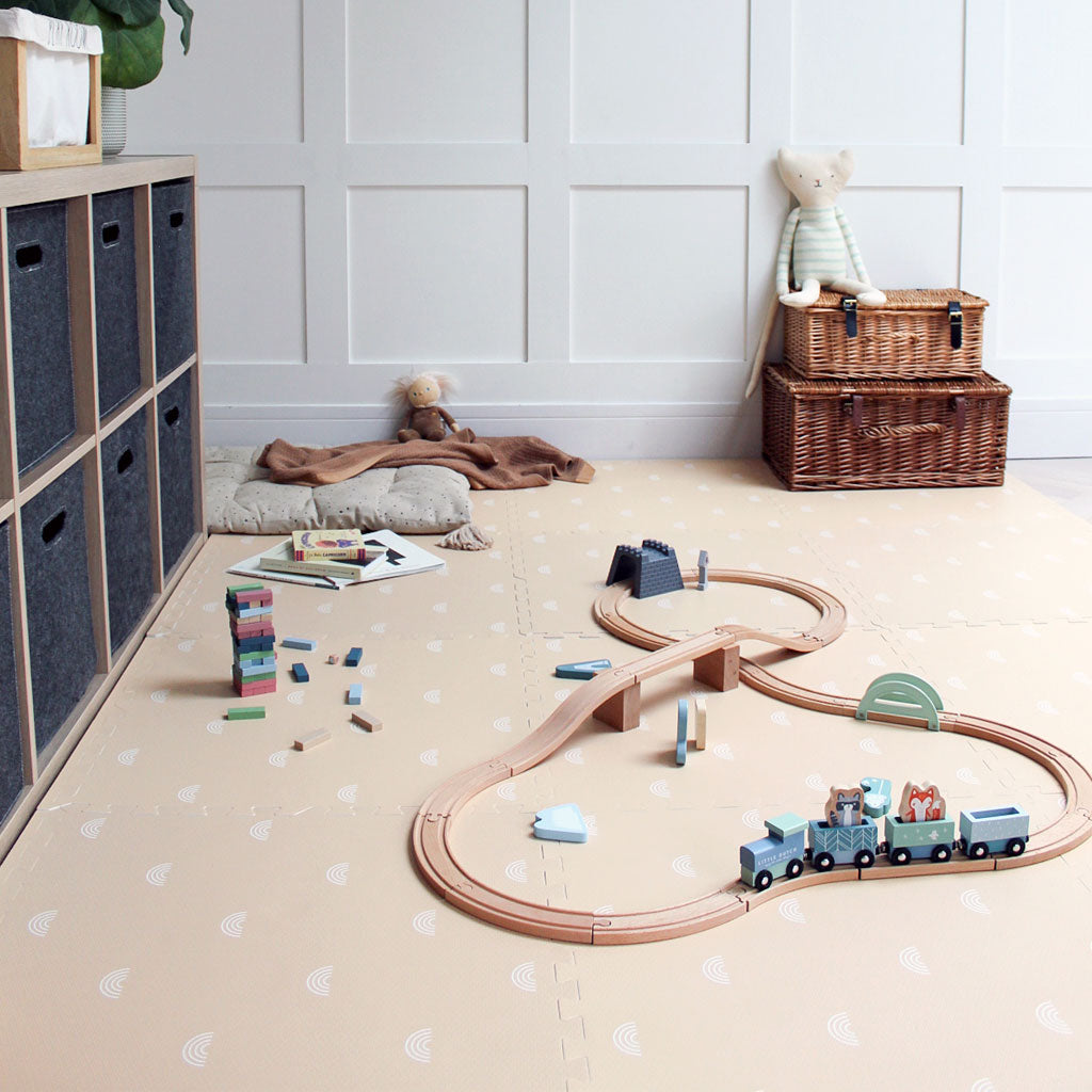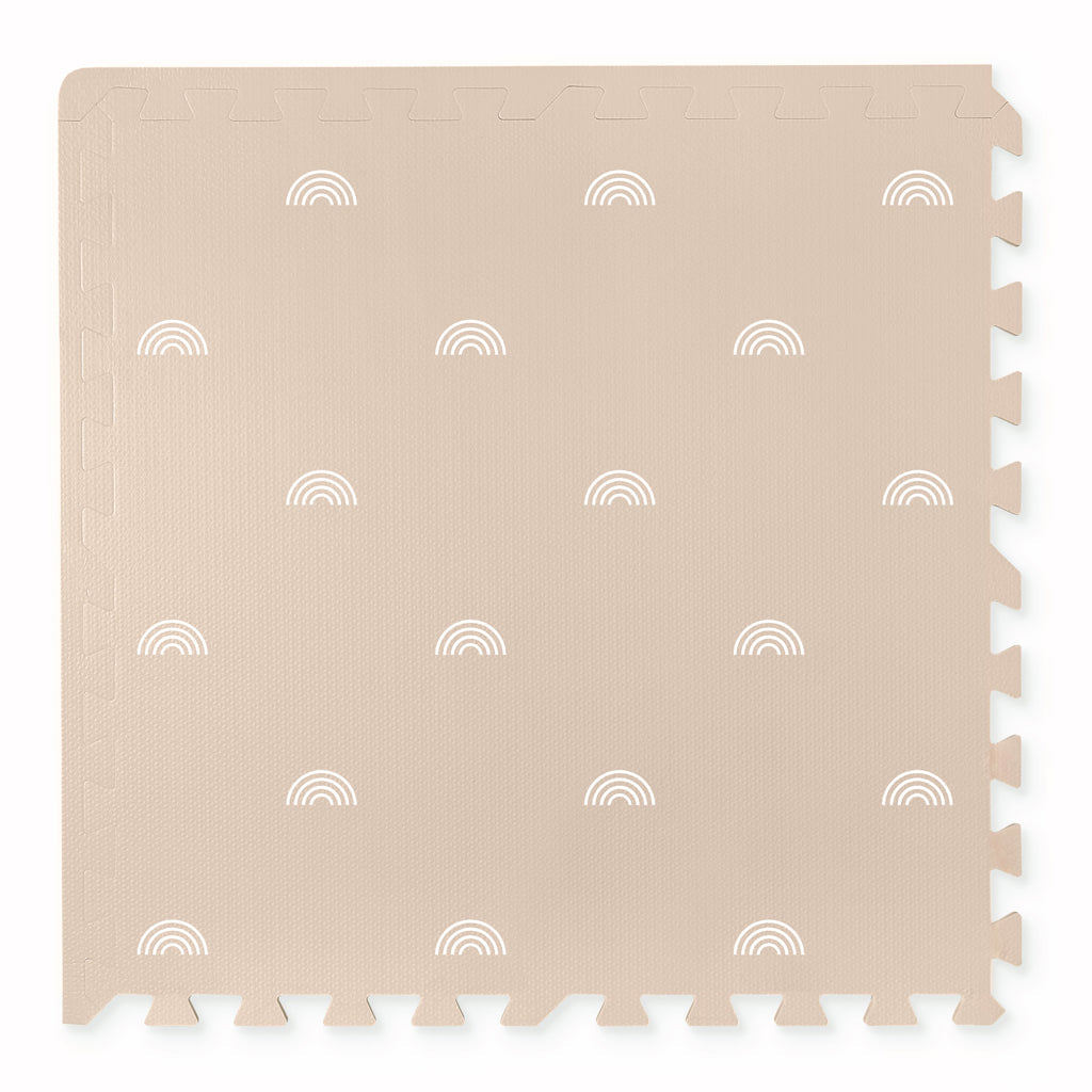Our bestselling Rainbow baby playmat is now available in a brand new colour. Beige with white rainbows. The perfect addition to your baby's play area. Made with premium, non-toxic eva foam, it provides a safe and comfortable space for your little one to play and explore.