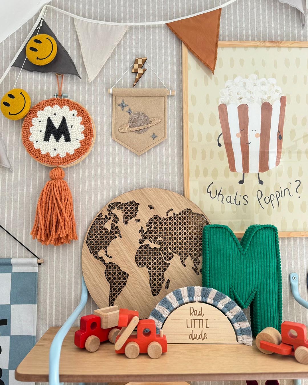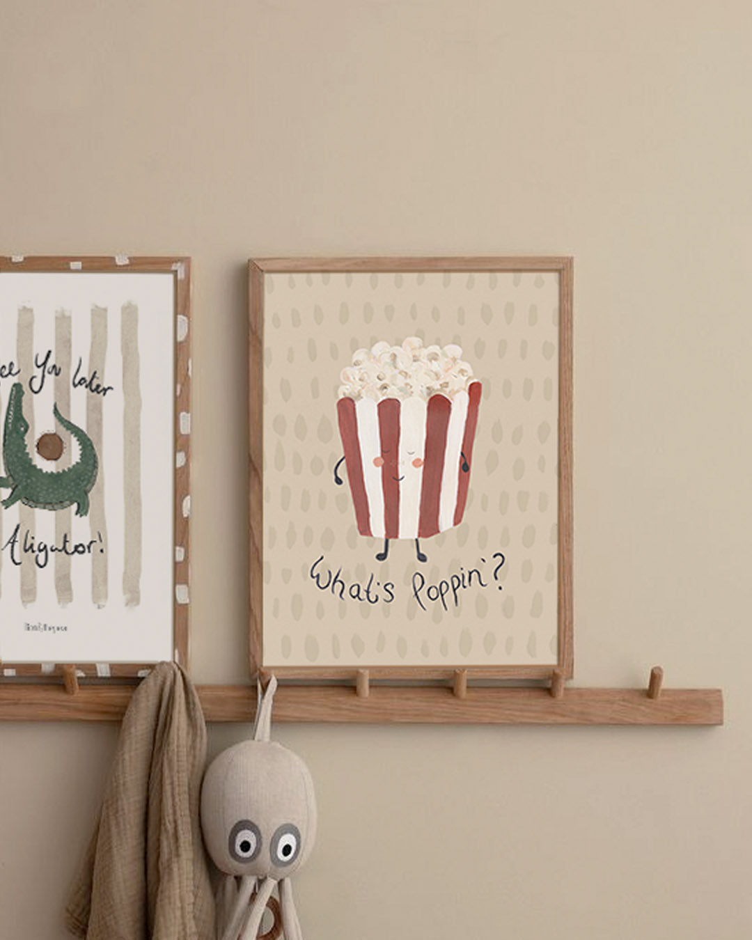 This fun Popcorn Print is part of our Bon Appetit collection. Painted in Acrylic paint on a neutral pattern background.