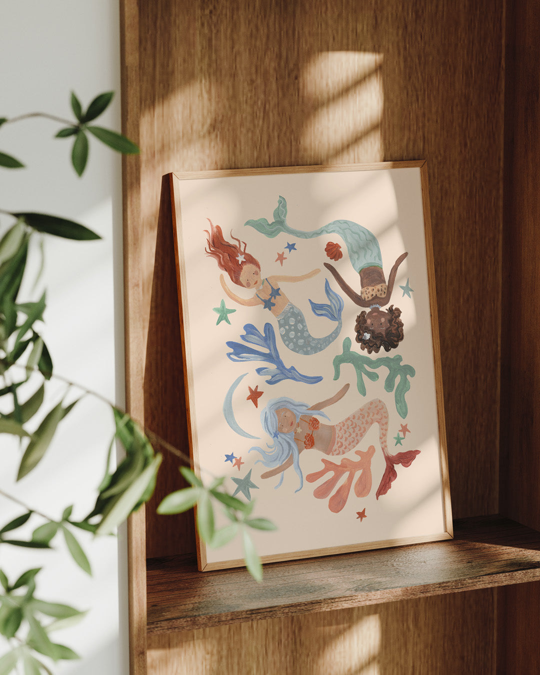 Hand-painted Mermaid Gang. Mix and match with our Under The Sea collection to complete their ocean-themed spaces.