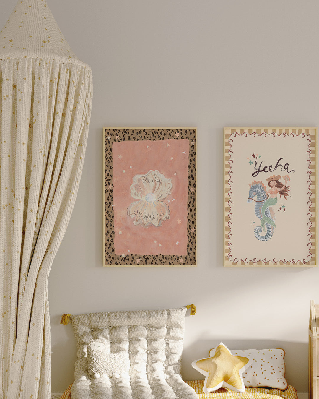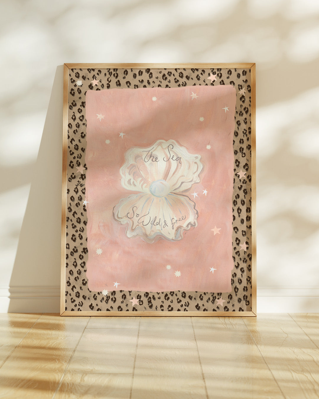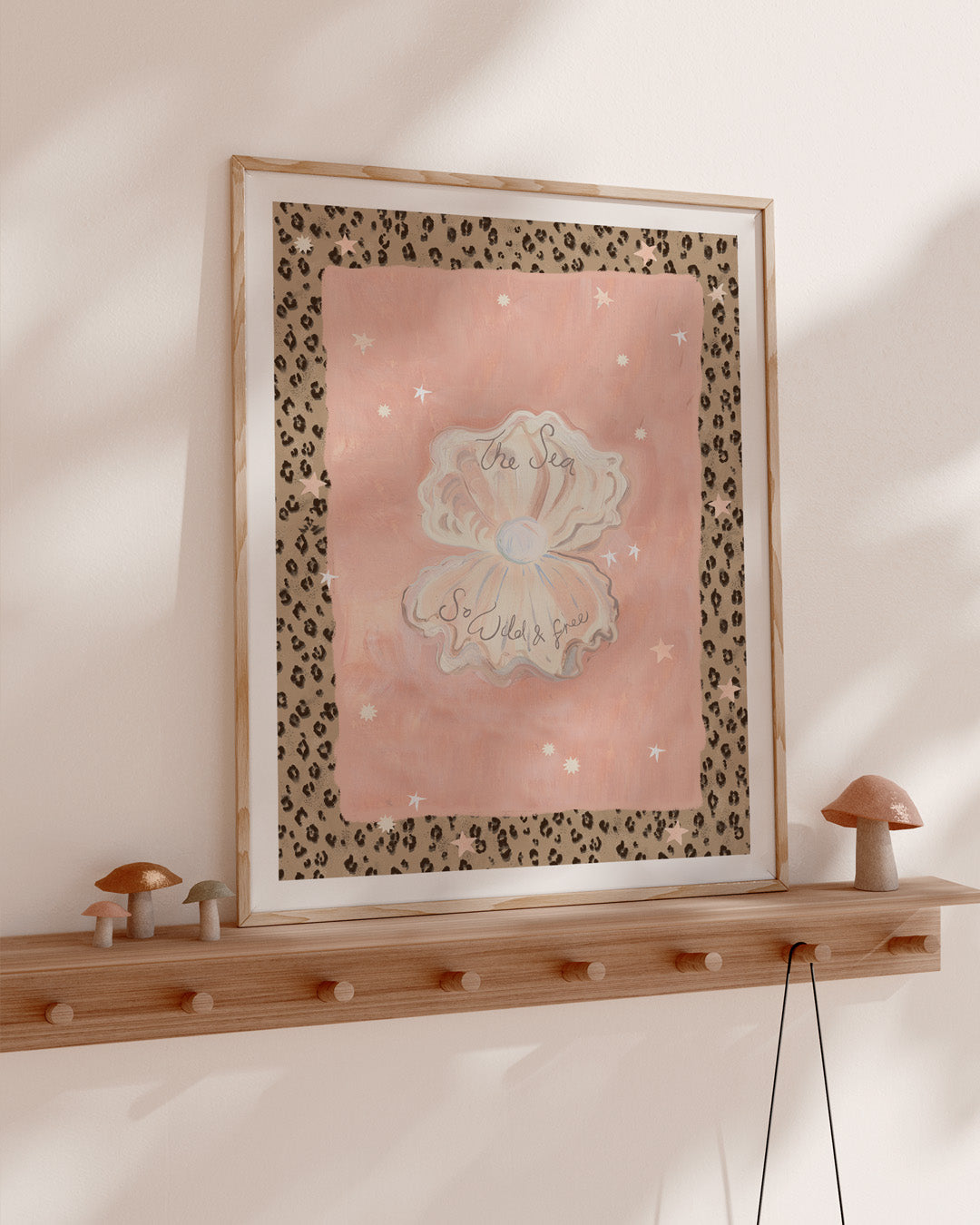 Hand-painted Shell Print with hand-painted leopard print border. Mix and match with our Under the Sea collection to complete their ocean-themed spaces.